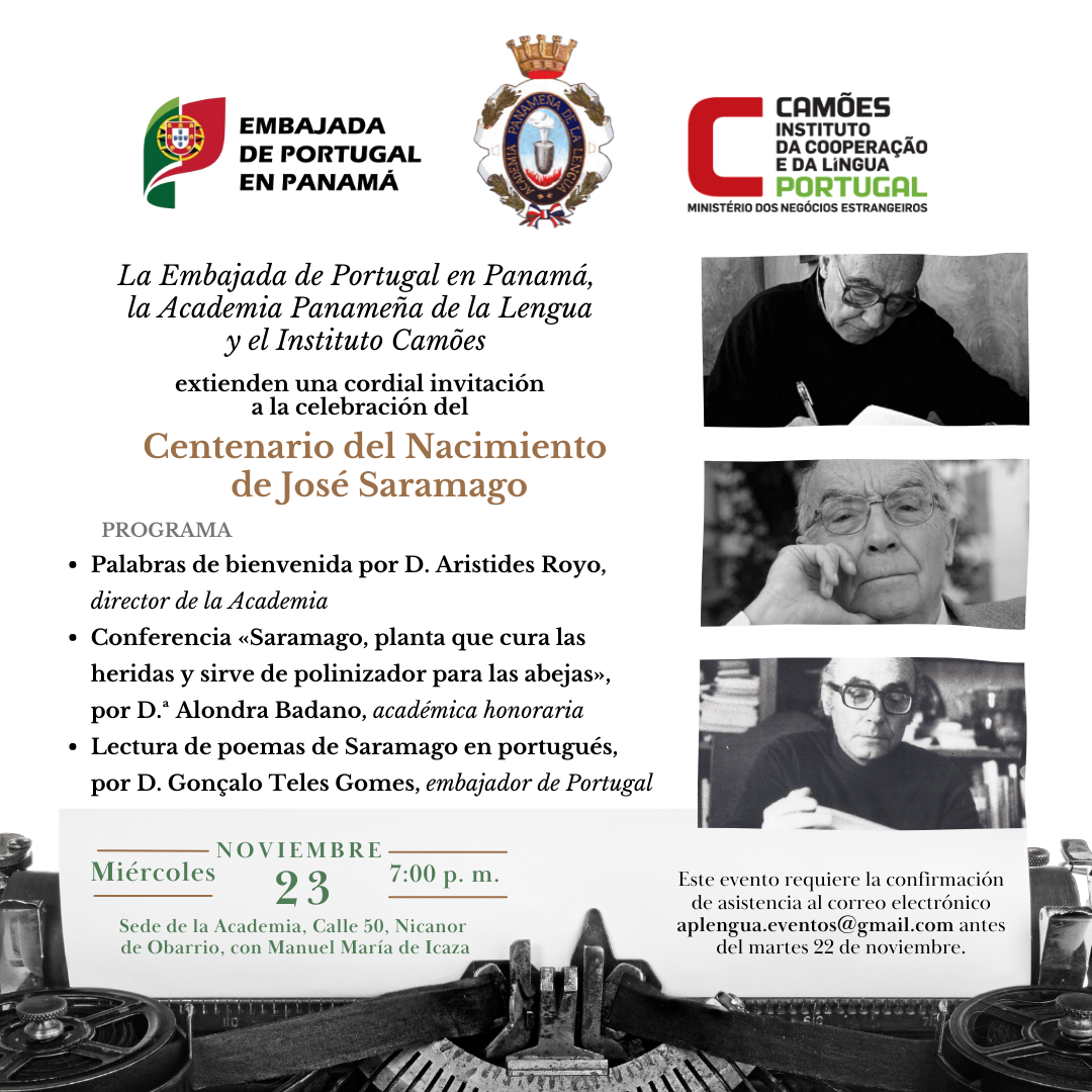 La Embajada de Portugal en Panamá, la Academia Panameña de la Lengua y el Instituto Camões extienden una cordial invitación a la celebración del Centenario del Nacimiento de José Saramago.